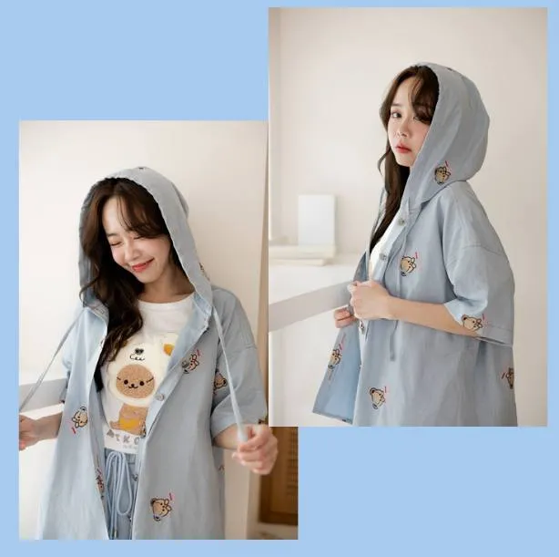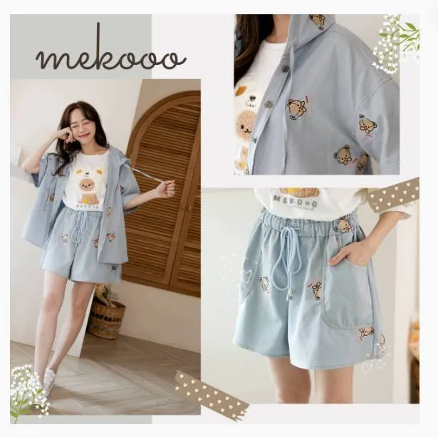 【MEKOOO】米果熊刺繡牛仔連帽襯衫外套