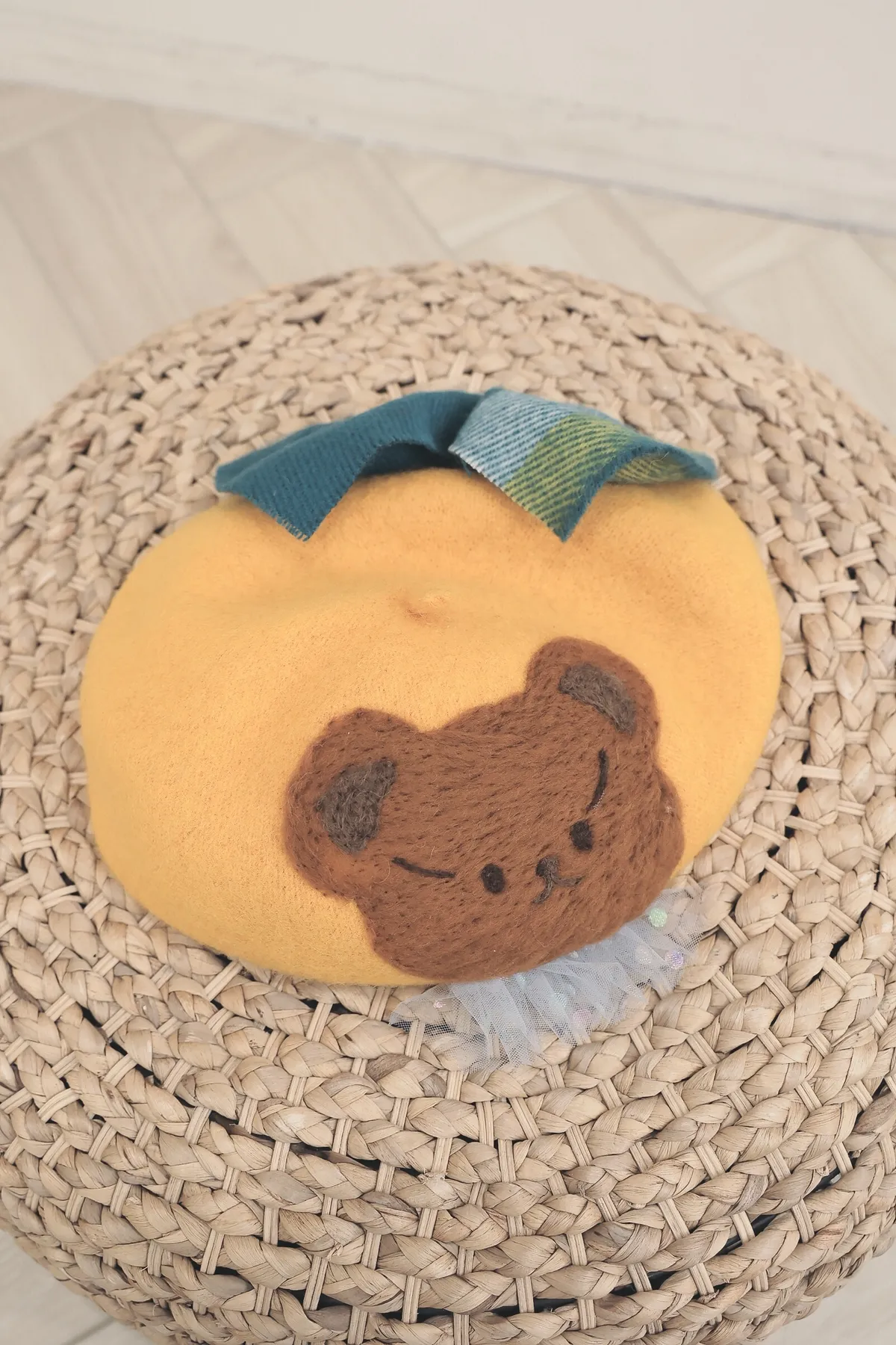 【日本KU手作家】橘色米果熊格紋大蝴蝶結貝蕾帽