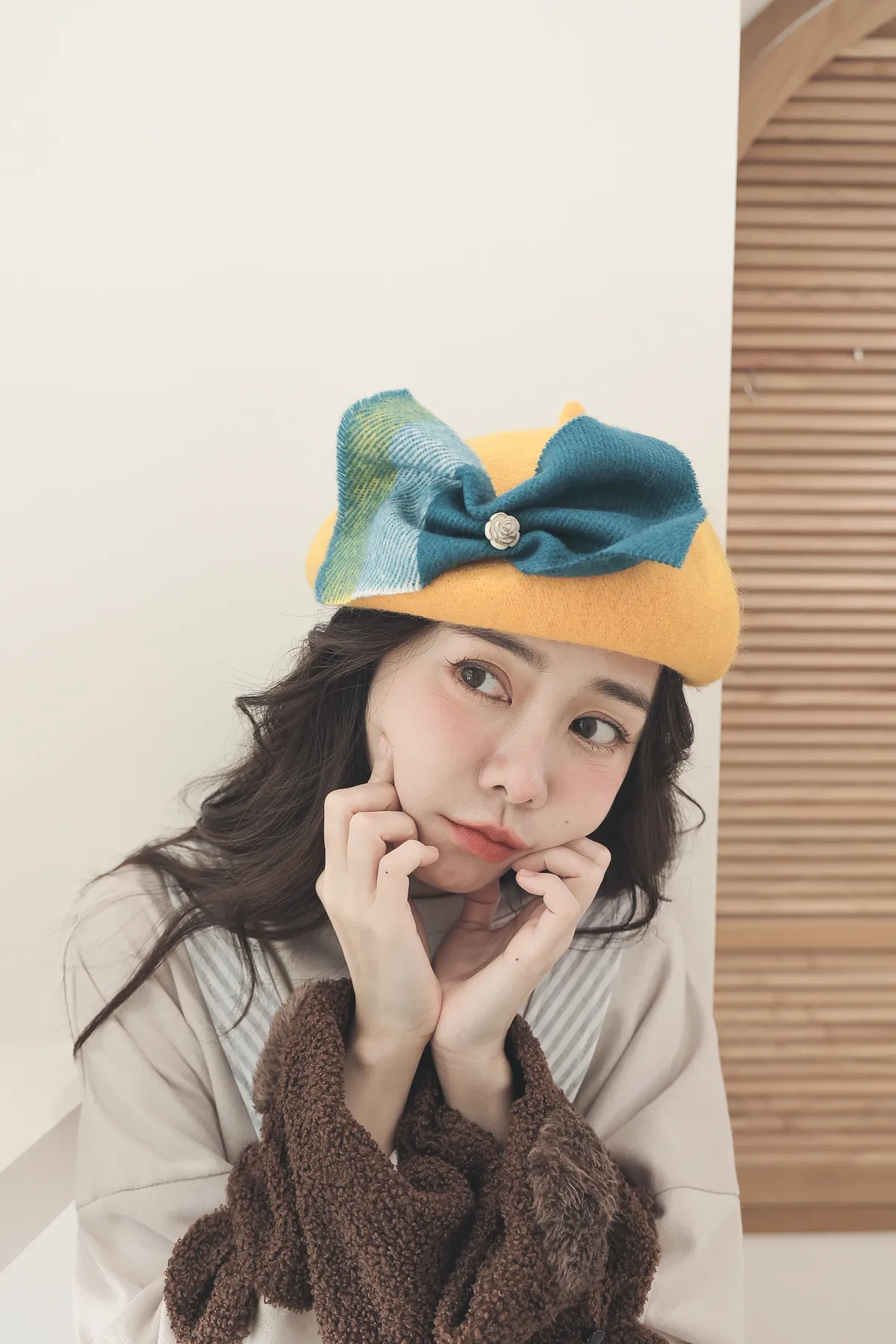 【日本KU手作家】棕色米果熊格紋大蝴蝶結貝蕾帽